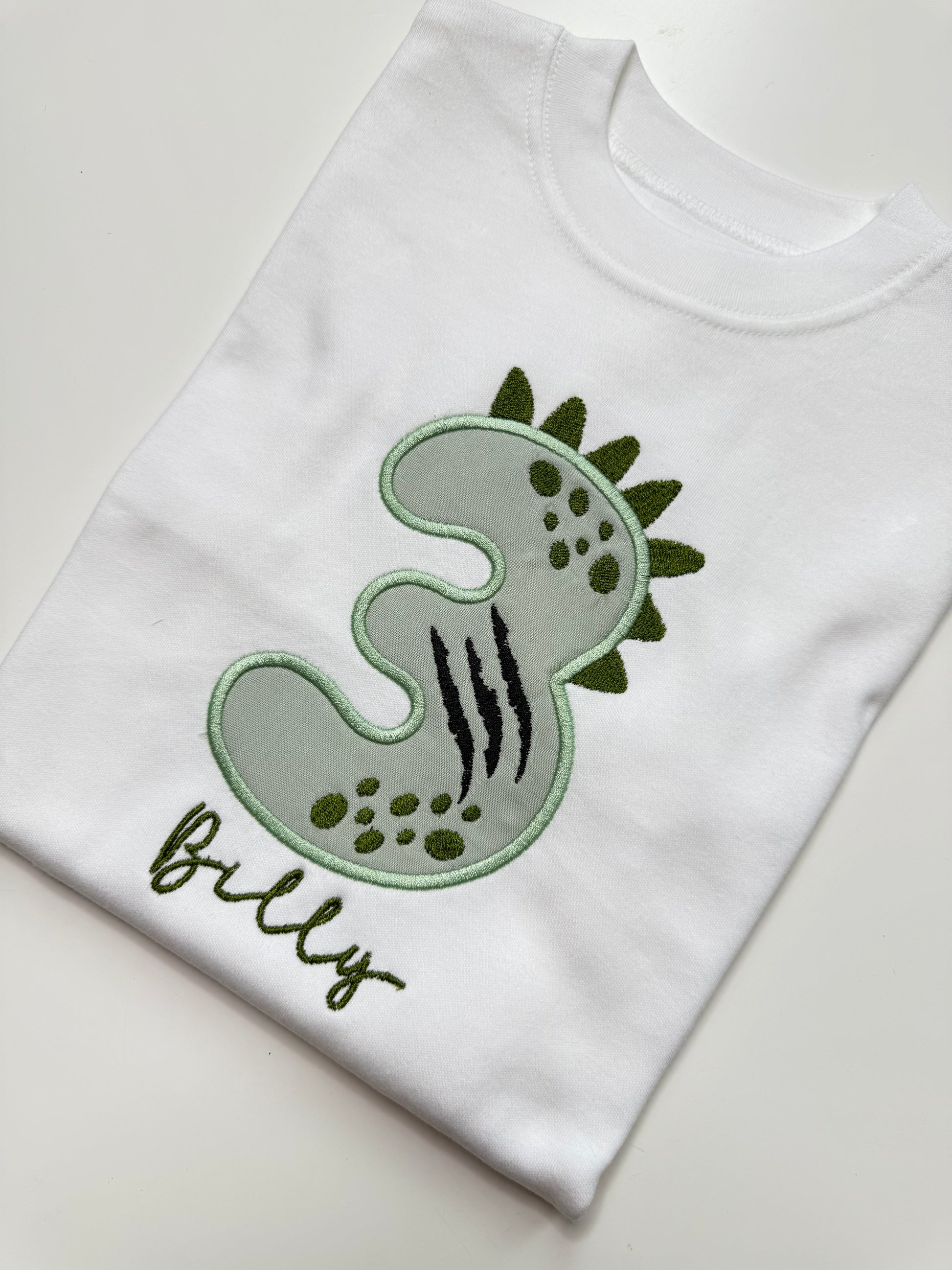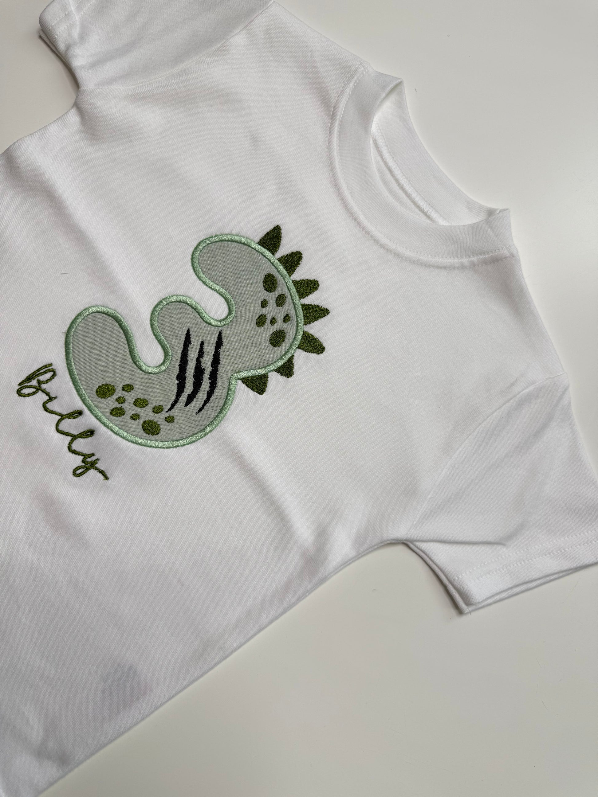 Celebrate your special day in style with our white Dinosaur Birthday Number T-Shirt. This stylish T-shirt features an applique dinosaur shaped number, adding a touch of cute to your birthday outfit. Stand out from the crowd and make a statement with this unique and fashionable piece.
